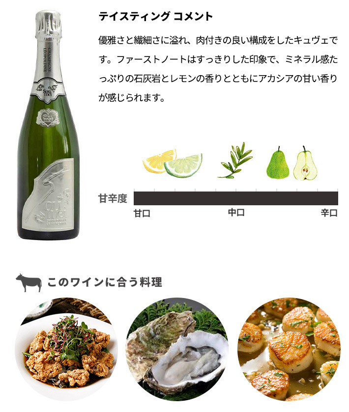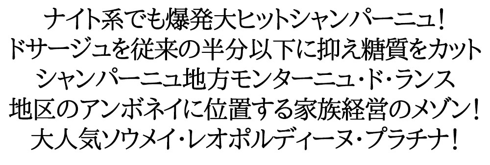 昨今、パーソナルトレーニングや糖質制限など健康志向が強まる中、ドサージュ(補糖)を従来の半分以下に抑え糖質をカットし、ライトで芳醇なシャンパンに仕上がりました。ソウメイはレオポルディーヌソウメイはシャンパーニュ地方モンターニュ・ド・ランス地区のアンボネイに位置する家族経営のシャンパーニュ・メゾンです。