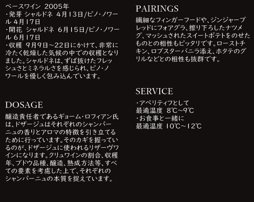 ニコラ・フィアット・パルム・ドール・ブリュット・ゴールド・エディション・シャンパーニュ ぶどう品種:ピノ・ノワール50%/シャルドネ50% 世界のシャンパン愛好家争奪戦のコレクター作品!しかもマルチヴィンテージのプレステージキュヴェにピッタリの純度の高い宝石のようなゴールドをまとった超限定ボトル!シャンパーニュ・ニコラ・フィアットが最高の芸術作品として生み出すパルム・ドールブランドの最高級日本限定商品! このマルチヴィンテージのシャンパーニュは、とても個性的であり、尚且つこのシャンパーニュには欠かせないモングーのシャルドネが7%入っています!このモングーのシャルドネにより、力強く凝縮感のあるアロマを感じることができます!パルム・ドール・ゴールドは、シャンパーニュ・ニコラ・フィアットの象徴的で欠かすことの出来ない存在であり、それは正に醸造責任者であるギョーム・ロフィアン氏の最高傑作と言えるプレステージキュヴェの究極シャンパーニュ! 外観は深いゴールドの色合いで、繊細でいきいきとした泡が立ち上る様子は、まるでグラスにゴールドのネックレスが描かれたようです!