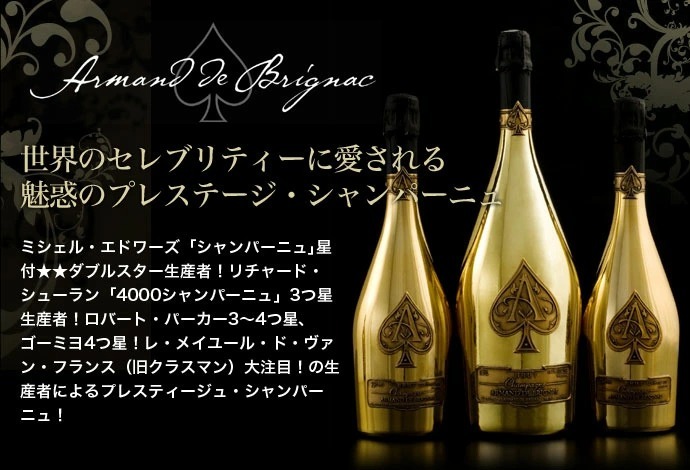 「アルマンド」として日本でも愛されるアルマン・ド・ブリニャック。 そのエレガントなスタイルと上質な口当たりが好まれ、ワンランク上のパーティや本当に大切な会食の場を彩るのに欠かせないシャンパーニュとして、世界中で高い評価を頂いています。