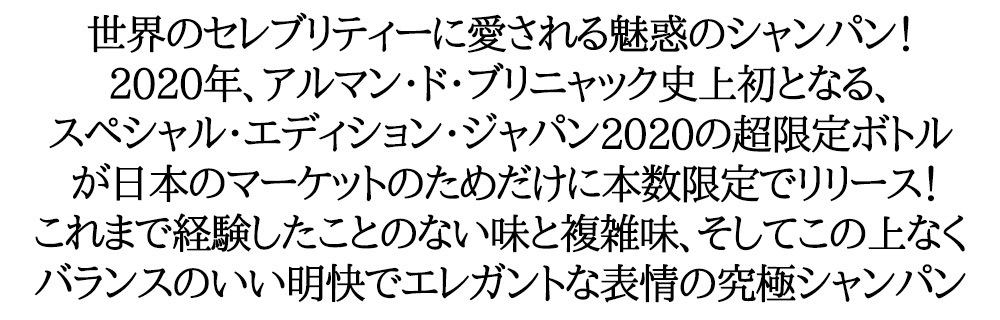 爆発人気!超有名!超高級シャンパーニュ愛好家大注目!高級辛口シャンパーニュ愛好家垂涎!世界のセレブリティーに愛される魅惑のプレスティージュ・シャンパーニュ!しかも、2020年アルマン・ド・ブリニャック史上初となる限定ボトルが日本のマーケットのためだけに本数限定リリース!しかもこのブリュット・スペシャル・エディション・ジャパン2020は、15年以上かけて誇りをもってプロデュースされてきたアルマン・ド・ブリニャックが、日本のマーケットのためだけに生産した限定のスペシャル・プレステージ・キュヴェです!これまで経験したことのない味と複雑味、そしてこの上なくバランスのいい明快でエレガントな表情の究極シャンパーニュ!シャンパーニュファンのバイブルと呼ばれるRichard Juhlinsの「4000Champagne」でも3つ星生産者に選ばれている究極生産者!モンターニュ・ド・ランスで18世紀から歴史ある家族経営の生産者“キャティア”による、究極スペシャル高級シャンパーニュ!アメリカではベッカム夫妻のロサンゼルス移住パーティーやジョージ・クルーニーのチャリティーパーティーで使用され、ラッパーのJAY-Zやトム・クルーズも愛飲!ハリウッドのセレブにも浸透!「100 Best Champagne for 2010」において、世界でも著名な評論家達やソムリエ達のブラインドテイスティングにより、世界ランキング第一位を獲得!このキュヴェはシャルドネとピノ・ノワールのぶどうのみを使った初めての試みで、希少価値の高い日本だけの特別限定リリース品は、5年以上寝かせた醸造家お墨付きのシャンパーニュ!造り手からのテイスティングノートは『シトラスフルーツ、ドライフルーツ、オレンジの花の新鮮な香り。これらのアロマはピーチ、パイナップル、ホワイトチョコレート、白い花とスパイスの香りで引き立たされます。口当たりはまろやかでクリーミー。リンゴ、チェリー、ラズベリー、カラント、ピーチ、アプリコット、そしてシトラスのフルーツで口の中が満たされるようです。ほのかなヘーゼルナッツ、スミレと共にエレガントなスパイスの後味が感じられます。』また、食事との相性についても『食前酒として最適。またスパイスのきいたフォアグラ、グリルした魚、レモンソースとゆでたロブスター、ローストしたカモとの相性は完璧です。またこのシャンパンは新鮮なお刺身、特に脂ののった厚めに切ったマグロとは最高のペアリングになるでしょう。ピーチやアプリコットのパイやクラフティとのペアリングも試してみてはいかがでしょうか。日本の桃のパフェやあんみつともこのキュヴェは相性がいいでしょう。』とコメント!伝統的なシャンパーニュブレンドと、最も賞賛される地域のテロワールからのトリオヴィンテージはすべてのアルマン・ド・ブリニャックのキュヴェの特徴でもあり、新鮮な果実のキャラクターと複雑味をもたらします!このユニークで限定生産のシャンパーニュは、ゴールドメタルコーティングされたボトルに“Edition Speciale Japon”と刻印されたフレンチピュターラベルが1本1本手作業でつけられています!非常に高級で入手困難なシャンパーニュが、高級シャンパーニュ愛好家大注目の逸品が正規代理店輸入品でギフト箱入りで限定で極少量入荷!
