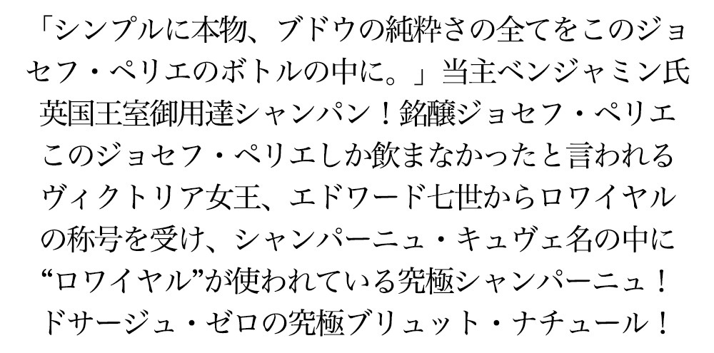 ジョセフ・ペリエ・シャンパーニュ・“キュヴェ・ロワイヤル”・ブリュット・ナチュール ■葡萄品種:シャルドネ35%/ピノ・ノワール35%/ムニエ30% ロバート・パーカー4つ星生産者!ゴーミヨ誌4つ星、ミシェル・エドワーズ「シャンパーニュ」でも高評価!ル・クラスマン誌に「実にまろやかなシャンパーニュ。味にうるさい通を唸らせるような切り札をそろえているといってもいい」と絶賛!シャンパーニュ愛好家のバイブルとも言われるリチャード・ユーリンのア・セント・オブ・シャンパーニュでも高い評価を獲得! シャルドネ35%、ピノ・ノワール35%、ムニエ30%!しかも貴重なリザーヴワインを24%使用!6年以上の瓶内熟成!しかもドサージュ0g/Lの最辛口仕上げ! 深いルビー色がかった金色と軽やかな泡!繊細な薔薇と牡丹の香りから始まり、それが徐々に強いスパイスの香りと絡みついていきます! 林檎と洋梨、そして桃とネクタリンが初めに表れ、最後に胡椒の風味に続いていく、食前酒に最適な爽やかな究極シャンパーニュ!寿司、貝によく合い、アジア料理と完璧な相性!