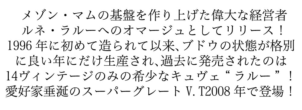 マム シャンパーニュRSRVキュヴェ ラルー プレステージ ブリュット ミレジム 2008 あのシャンパンファン伝説のキュヴェが最高のヴィンテージで25年ぶりに復活!メゾン・マムの基盤を作り上げた偉大な経営者ルネ・ラルーへのオマージュとしてリリースされた最高級プレステージシャンパーニュ「キュヴェ・ラルー」がマム最高品質に付けられるRSRVの新ライナップとして生まれ変わりました! 映画「カサブランカ」や「F1」レース公式シャンパーニュとしても有名なマム社! 美しくきらめく黄金色!バニラやハチミツ、ヘーゼルナッツのアロマ、熟した黄色い果実のような香り! 複雑で芳醇、まろやかでリッチでありながらも、力強い味わいの究極シャンパーニュ! 1996年に初めて造られて以来、ブドウの状態が格別に良い年にだけ生産され、過去に発売されたのは14ヴィンテージのみの希少なキュヴェ“ラルー”!