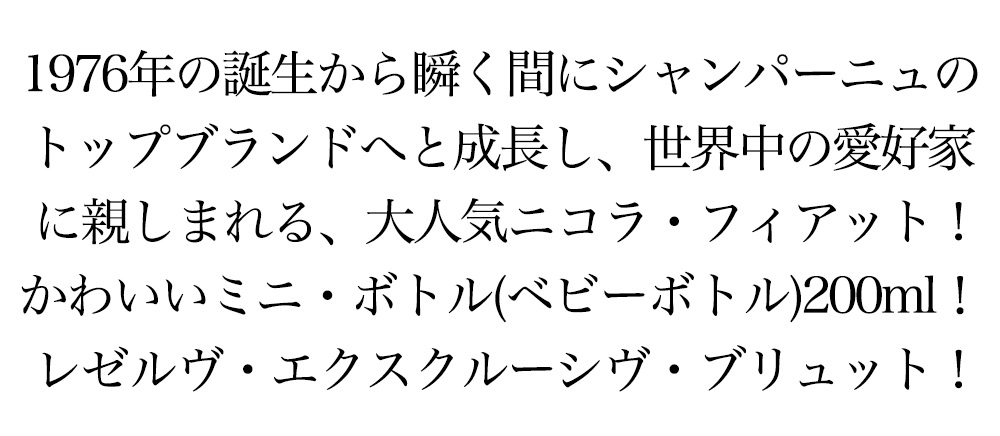 ニコラ・フィアット・シャンパーニュ・レゼルヴ・エクスクルーシヴ・ブリュット 200ml ■葡萄品種:ピノ・ノワール40%/ピノ・ムニエ40%/シャルドネ20% ■瓶熟成:36ヶ月以上 販売量フランスNo.1! “ニコラ・フィアット”のベビーボトルのシャンパーニュ・レゼルヴ・エクスクルーシヴ・ブリュット・ミニ(200ml)! 世界第3位のシャンパーニュ・ブランド! ブリストルやギー・サヴォアを始めとする高級レストランやエールフランス、シンガポール航空、全日空(ビジネスクラス)にも採用! ロバート・パーカー4つ星生産者であり、ワインスペクテーター誌驚異の高評価!ワインエンスージアスト誌やステファンタンザー、ヴィノス誌も大注目! シンプルでありながらも、その中に複雑味や爽やかさ、そして何にでも合わせやすい万能的なシャンパーニュが可愛いミニボトルで正規代理店輸入品で限定少量入荷!