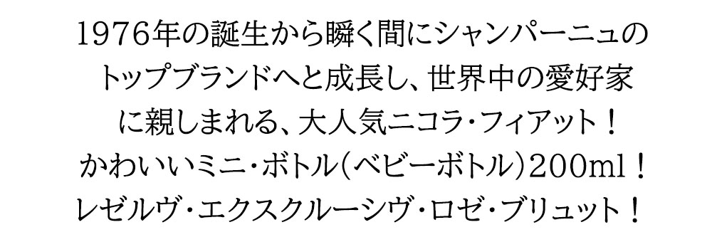 ニコラ フィアット シャンパーニュ レゼルヴ エクスクルーシヴ ロゼ ブリュット ミニ ■ぶどう品種:ピノ・ノワール45%/ピノ・ムニエ45%/シャルドネ10% ピンク・シャンパーニュ辛口愛好家大注目!販売量フランスNo.1! 人気ロゼ・シャンパーニュのかわいいミニ・ボトル!世界第3位のシャンパーニュ・ブランド! 1976年の誕生から瞬く間にシャンパーニュのトップブランドへと成長、世界中の愛好家に親しまれる人気シャンパーニュのロゼ! “ニコラ・フィアット”のベビーボトルのシャンパーニュ・レゼルヴ・エクスクルーシヴ・ロゼ・ブリュット ミニ 200ml! ロバート・パーカー4つ星生産者であり、ワインスペクテーター誌驚異の高評価!ワインエンスージアスト誌やステファンタンザー、ヴィノス誌も大注目! シャンパーニュ愛好家を魅了する非常にバランスの良い、見事に洗練された軽やかなシャンパーニュ! 何にでも合わせやすい万能的なシャンパーニュが可愛いミニボトルで正規代理店輸入品で限定少量入荷!