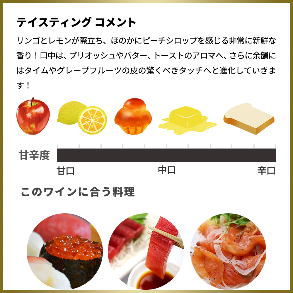 リンゴとレモンが際立ち、ほのかにピーチシロップを感じる非常に新鮮な香り!口中は、ブリオッシュやバター、トーストのアロマへ、さらに余韻にはタイムやグレープフルーツの皮の驚くべきタッチへと進化していきます!