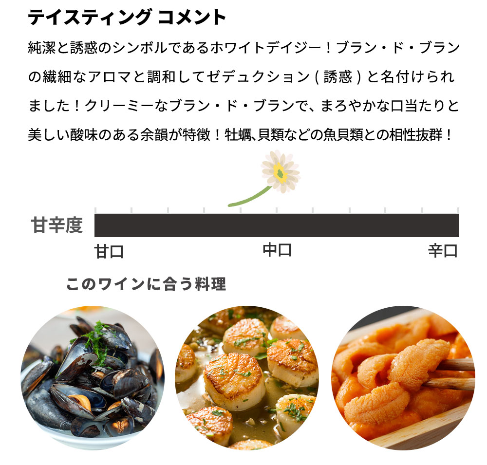マルグリット ギュイヨ シャンパーニュ キュヴェ ゼデュクション ブラン ド ブラン ブリュット シャルドネ100% 星付きレストラン採用 ■ぶどう品種:シャルドネ100% ■発酵・熟成:マロラクティック発酵なし/瓶熟成36ヶ月以上 ■ドサージュ:7g/L 2022年にはフランスの星付きフレンチレストラン「ポール・ボギューズ(Paul Bocuse)」に採用されるなど、知る人ぞ知るシャンパーニュとして確実にその名を広めています! 味わいのスタイルは、コクがありながらも決して重すぎず、繊細でキメ細かい泡立ちでミネラル感とバランスの取れた酸が魅力!ハーモニーを重視し、長い瓶熟成によって、より複雑な表現力を感じさせるスタイルを見事に確立させています! 各品種の個性を活かせるよう、低ドサージュでなおかつ、全キュヴェが、マロラクティック発酵を行わない独特のシャンパーニュでもあることも他社とは異なる個性を感じることが出来ます!少しエスプリが効いて、しなやかで優雅なシャンパーニュ!