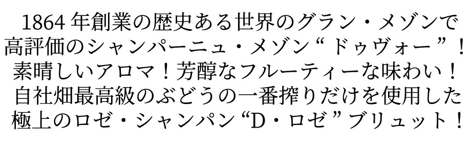 高級シャンパーニュ辛口・ロゼ愛好家大注目!世界のグラン・メゾンで高評価のシャンパーニュ・メゾン!1864年創業、本拠地はバール・シュール・セーヌでフランスはもとより世界中のグラン・メゾンで愛されるシャンパーニュメゾン!非常に低いレベルの補糖によって、ピュアで力強い味わいがそのまま表現され、長期熟成を経ながらもフレッシュさがあり、しっかりとした味わいを残す究極辛口シャンパーニュ!食前酒としてだけでなく食事を通して様々なシーンで活躍するシャンパンとして注目を集め、現在イギリス、ドイツ、イタリア、ベルギーなどをはじめ世界40ヶ国から賞賛の声で迎えられています!ワイン誌からの評価も高く、ベタンヌ&ドゥソーヴでもWスターの高評価!レビュー・デュ・ヴァン・ド・フランス誌大注目!ジルベール&ガイヤールでも驚異の高評価!ワインスペクテーター注目!なんと!デュセール&ジェルベでは、1es Grands Vins Classesに格付の快挙(これはクリュッグ、ポル・ロジェ、テタンジェなど9社のみ(Purssance))!アシェット・ガイド誌でも掲載大注目!この「ドゥヴォー・シャンパーニュ“D・ロゼ”ブリュット」は、自社畑最高級のぶどうの一番搾りだけを使用した極上のロゼ・シャンパーニュ!ピノ・ノワール55%にシャルドネ45%!そのうち赤ワイン(ピノ・ノワール)10%、ドサージュ6g/L(オーク樽熟成&100%マロラクティック発酵)しかも最低60ヶ月以上熟成!で造られるこのD・ロゼは、色合いはアプリコットサーモンピンクで、エレガントな泡と光沢のある輝きをもっています!小さな赤い果実のフレッシュな香りからゆっくりと花の香りへと移り変わっていきます!繊細なレッドカラント、ラズベリー、アプリコットの香りとともに芳醇なフルーティーな味わいを感じます!ドゥヴォー・シャンパーニュ“D・ロゼ”ブリュットがギフト箱入りで限定で極少量入荷!(おすすめの料理は、セップ茸のフリカッセ、スパイスの効いたオマール海老、赤いベリーの果実のパン、ストロベリーを使用したデザートなど)