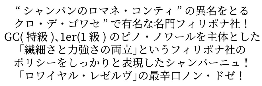 フィリポナ シャンパーニュ ロワイヤル レゼルヴ ノン ドゼ メニル シュール アイ AOCシャンパーニュ 正規代理店輸入品 750ml ■ぶどう品種:ピノ・ノワール主体70%/シャルドネ28%/ピノ・ムニエ2% “クロ・デ・ゴワセ”で有名な名門フィリポナ!小さなシャンパン会社(現在はボワゼル・シャノワールグループの所有)でしっかりした構成を持つシャンパーニュで定評! ベタンヌ&ドゥソーヴではこのロワイヤル・レゼルヴを「豊かな泡、クリーミー、熟したシャンパーニュで洋梨のタルトのニュアンスが。軽やかでバランスのいい余韻を備え、味わい深い」と絶賛! ファースト・プレスを100%使用!しかもヴァン・ド・レゼルヴを全体の27%も使用!ドサージュ0g/Lの最辛口仕上げのノン・ドゼ! ドザージュ無しの極辛口で、甘さを加えない事でベースとなるワインの各要素や品質がよりくっきりと浮かび上がります! 「繊細さと力強さの両立」というフィリポナのポリシーをしっかりと表現した渾身ロワイヤル・レゼルヴ・ノン・ドゼが正規代理店輸入品で少量入荷!