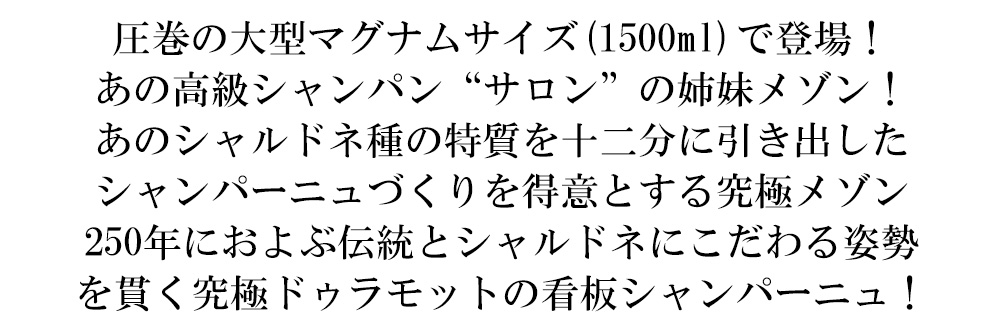 【大型ボトル】ドゥラモット シャンパーニュ ブリュット(ドゥラモット社) ル メニル シュール オジェ AOCシャンパーニュ 1500ml 辛口 ■ぶどう品種:シャルドネ50%/特級ブジー産とアンボネ産ピノ・ノワール30%/ヴァレ・ド・ラ・マルヌ産ピノ・ムニエ20% 高級シャンパーニュ“サロン”の姉妹メゾン!あのシャルドネ種の特質を十二分に引き出したシャンパーニュづくりを得意とする究極メゾン(現在はローラン・ペリエ傘下)!!なんとサロンが造られない年は、サロン用のワインはこのドゥラモットに使われると言われます。 ワインプレスからの評価も高くこのブリュットで、ロバートパーカー3~4つ星生産者で、ワインアドヴォケイト誌で89点の高評価!ワインスペクテーター誌で驚異の90点高評価獲得!ワインエンスージアスト誌も90点!フォルスタッフ・マガジン驚異91点! Le Guide des Meilleurusでも大注目!ベタンヌ&ドゥソーヴでは2B&Dマーク高評価!大絶賛! 250年におよぶ伝統とシャルドネにこだわる姿勢を貫く究極メゾンによる、レモンジェラートやフローラルなオレンジの皮やハーブのアロマ!研ぎ澄まされた酸とミネラル!究極辛口シャンパーニュ!