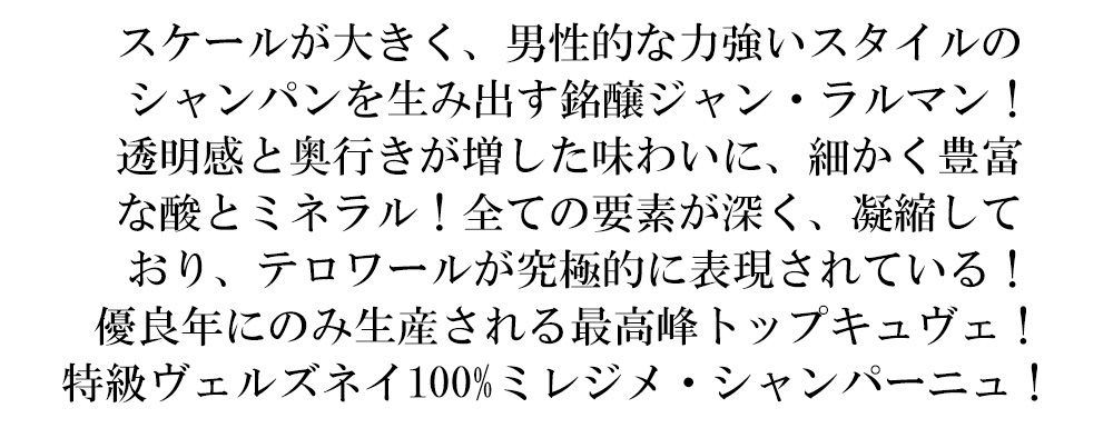 ジャン ラルマン グラン クリュ 特級 シャンパーニュ ミレジメ 2014 RM 生産者元詰 AOCヴィンテージ 自然派 ヴァンナ チュール 正規品 ■ぶどう品種:ピノ・ノワール種80%/シャルドネ種20% ■発酵・熟成:ホーロータンクで発酵&瓶内熟成驚異の96ヶ月以上/(自然酵母で発酵、MLFも行う。その後澱と共に熟成させる) ■樹齢:1958年植樹/樹齢35年以上のV.V ■土壌:白亜質の土壌/粘土質石灰石 ■ドサージュ:4g/L ■地形:北斜面 グラン・クリュ特級の格付100%のヴェルズネイ村100%!しかも素晴らしい出来の良年のみ造られる単一年産100%のヴィンテージ・シャンパーニュ!RM(生産者元詰)のドメーヌ100%シャンパーニュ愛好家垂涎のシャンパーニュ! モンターニュ・ド・ランスのグラン・クリュに格付された村の中でも、特に力強いフィネスを備えたシャンパーニュで有名な特級格付のヴェルズネイ村100%! ピノ・ノワールの聖地ヴェルズネイで植樹驚異の1958年植樹のV.Vの最上区画を所有!ヴェルズネイのテロワール(モンターニュ・ド・ランスのグラン・クリュでは疑う余地なく最良の特級畑ヴェルズネイ(流麗な質感の下にある芯の強さはミュジニーを、 バランスは、クロ・ド・ベーズを想わせる素晴らしいピノ・ノワールと言われる))が最大限に表現され、全ての要素が深く凝縮されている! このジャン・ラルマン・エ・フィス・グラン・クリュ・特級(ヴェルズネイ100%)・シャンパーニュ・ブリュット・ミレジム・シャンパーニュの2012年でワインスペクテイター誌驚異の92点&ワインアドヴォケイト誌93点獲得! 透明感と奥行きが増した味わいに、細かく豊富な酸とミネラル!全ての要素が深く、凝縮されている!将来の熟成が非常に楽しみな一本!クオリティのグラン・クリュ特級(ヴェルズネイ100%)シャンパーニュ!!