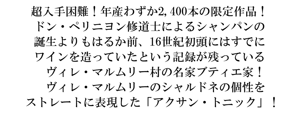 マノン・ブティエ・ゲール・シャンパーニュ“アクサン・トニック ”(2020)・蔵出し品・エクストラ・ブリュット(シャルドネ80%、ヴァン・ド・レゼルヴ20%)・ドサージュ2g/L・RM・生産者元詰・最低2年間ビン熟成・年産わずか2400本のみの超限定作品・AOCシャンパーニュ・エクストラ・ブリュット・デゴルジュマン2022年6月 ■ぶどう品種:シャルドネ80%/ヴァン・ド・レゼルヴ20% ■発酵・熟成:2年間ビン熟成 ■平均樹齢:35年 希少!RMブラン・ド・ブラン辛口シャンパーニュ愛好家大注目!しかもコート・デ・ブランのシャルドネよりもさらにミネラリーで、より果実味豊かなスタイルのシャルドネと定評のヴィレ・マルムリー産のシャルドネ! しかも年産わずか2,400本のみの超希少R.Mシャンパーニュ!しかも2021年度「Jeunes Talents du Champagne(シャンパーニュの若き才能)」 の「シャルドネ部門」の栄冠に輝いた若き女性生産者! このシャルドネは、コート・デ・ブランのシャルドネよりもさらにミネラリーで、より果実味豊かなスタイルになります。また、強い花の香りも大きな特徴です。 作品名の「アクサン・トニック」は「強勢アクセント」の意味で、ヴィレ・マルムリーのシャルドネの特徴である強い花のアロマを表しています!ヴィレ・マルムリーのシャルドネの個性をストレートに表現したことを例えたものです!