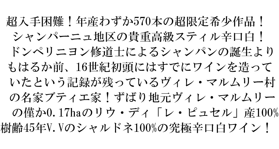マノン ブティエ ゲール コトー シャンプノワ ブラン ヴィンテージ 2020 白ワイン フランスワイン シャルドネ 年産570本のみ ロウキャップ ■ぶどう品種:ヴィレ・マルムリーのわずか0.17haのリウ・ディ「レ・ピュセル」産100%のVVのシャルドネ100% ■発酵・熟成:ステンレスタンクで発酵後、12ヶ月間熟成 ■樹齢:平均樹齢45年のVV ■土壌:白亜質土壌 ■収穫:手摘み ■地形:ランス山の真東~東南東にかけての地勢(東向き斜面) ■ 葡萄畑面積:ヴィレ・マルムリーは総植樹面積246ヘクタールのうち、98.1%をシャルドネ(残り1.9%はピノ・ノワール) 入手困難!コトー・シャンプノワ・ブラン愛好家大注目!シャンパーニュ地区の貴重高級スティル辛口白ワイン!年産僅少! 「Jeunes Talents du Champagne(シャンパーニュの若き才能)」 の「シャルドネ部門」の栄冠に輝いた若き女性生産者!「Guide Hachette」、「Gilbert & Gaillard」等ワインプレスも大注目! ブティエ家はこの村の名家で、ドン・ペリニヨン修道士によるシャンパンの誕生よりもはるか前、16世紀初頭にはすでにワインを造っていたという記録が残っています(日本は室町時代)! 2021年に「HVE(Haute Valeur Environnementale=高い環境価値)」の最高段階「レベル3」および「Viticulture Durable en Champagne(シャンパーニュにおける持続可能なぶどう栽培)」の認証を取得しています! 地元ヴィレ・マルムリーのわずか0.17haのリウ・ディ「レ・ピュセル」産100%のVVのシャルドネ100%!年間生産本数570本のみの超限定作品です!もちろん現地のセラー数ヶ月前の蔵出し品で限定少量入荷!