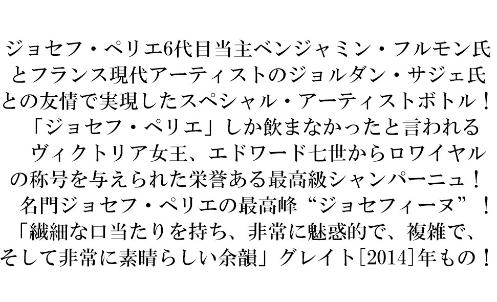 ジョセフ ペリエ シャンパーニュ キュヴェ ジョセフィーヌ×ジョルダン サジェ ブリュット ミレジム 2014 白 辛口 正規品 フランス 英国王室御用達シャンパーニュ!ジョセフ・ペリエ6代目当主ベンジャミン・フルモン氏とフランスの現代アーティストのジョルダン・サジェ氏との友情で実現したアーティストボトルが超限定入荷 「ジョセフ・ペリエ」しか飲まなかったと言われるヴィクトリア女王、エドワード七世から「ロワイヤル」の称号を与えられた栄誉あるシャンパーニュ!現在でもチャールズ皇太子やアンドリュー皇子の結婚式などの指定シャンパーニュとして有名!ロバート・パーカー4つ星生産者!ゴーミヨ誌4つ星、ミシェル・エドワーズ「シャンパーニュ」3つ星! 「ジョセフ・ペリエ」しか飲まなかったと言われるヴィクトリア女王、エドワード七世から「ロワイヤル」の称号を与えられた栄誉あるシャンパーニュ! 現在でもチャールズ皇太子やアンドリュー皇子の結婚式などの指定シャンパーニュとして有名!ロバート・パーカー4つ星生産者! アメリカと、これまたワイン愛好家の多いイギリス人に高評価されている大人気シャンパーニュの最高評価! ジョルダン・サジェ氏、サジェは1980年生まれ、パリを拠点に活動する現代アーティスト、ストリートアーティスト。地下鉄の壁面などに、チョークで下書きすることなく描く。テンポラリーなものから恒久的なものまで、2000点以上の作品を制作している。これまでにアニエスベー、プランタン(百貨店)、ファッションデザイナーのジャン・シャルル・ド・カステルバジャックなど、さまざまなアーティストや企業とコラボレーションをしている。コラボレーションボトルで、しかも正規品のセラー出しの素晴らしい状態で限定少量入荷!