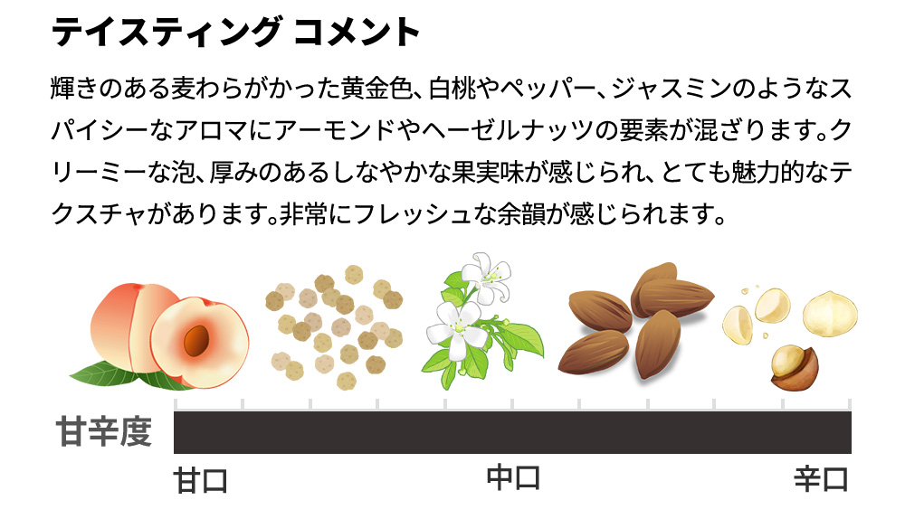 ■発酵・熟成:ベースワインの発酵、マロラクティック発酵はステンレスタンク/約8ヶ月タンクで熟成させた後、ブレンドし、5月に瓶詰め(ティラージュ)/澱と共にボトルで最低でも36ヶ月熟成