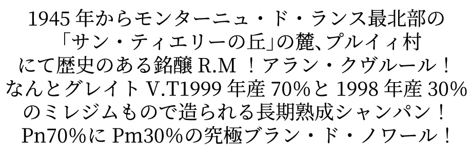 入手困難!希少!R.Mシャンパーニュ辛口愛好家大注目!なんと!!オールドヴィンテージシャンパーニュ愛好家大注目!グレイトの1999年ヴィンテージと人気の1998年ヴィンテージの2つのミレジメのみで造られるなんと!25年近くの熟成を経たV.Tのブレンドで造られた究極オールドN.Vシャンパーニュ!ジルベール&ガイヤール誌でも大注目!アシェット・ガイド誌やゴーミヨ誌大注目!Richard Juhlin“A scent of Champagne”でも大注目!1945年からモンターニュ・ド・ランス最北部の「サン・ティエリーの丘」のふもと、プルイィ村にて歴史のあるR.M!!そのほとんどが地元レストランとヨーロッパ中のシャンパーニュ愛好家に直行!(現在輸出はイタリアのみ!)人気の秘密はN.V.ながら収穫が90年代後半という、バックヴィンテージで造られる究極R.Mシャンパーニュ!このキュヴェ・ド・レゼルヴという名が付加されたブラン・ド・ノワール(平均樹齢25~30年のピノ・ノワール70%、ピノ・ムニエ30%)は、なんと1999年産70%と、1998年産30%のミレジムもので造られる長期熟成辛口シャンパーニュ!しかもびっくり!本格派エクストラ・ブリュット!ドサージュ6g/L!各種コンクール&ワインガイド激賞の逸品!究極アラン・クヴルール・シャンパーニュ・ヴィエイユ・キュヴェが限定で、しかも現地のセラー数か月前の蔵出しで限定少量入荷!