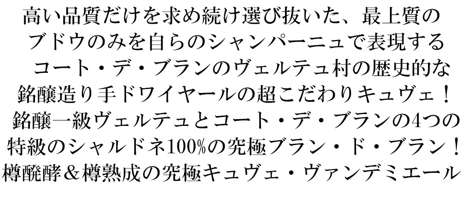 入手困難!生産者元詰の一級ヴェルテュとコート・デ・ブランの4つのグラン・クリュ特級のシャルドネ100%・シャンパーニュ愛好家大注目!ブラン・ド・ブラン・シャンパーニュの樽醗酵&樽熟成のブリュットの究極限定R.Mシャンパーニュ!高い品質だけを求め続け選び抜いた、最上質のブドウで自らのシャンパーニュを表現する、コート・デ・ブランの歴史的な造り手ドワイヤール!