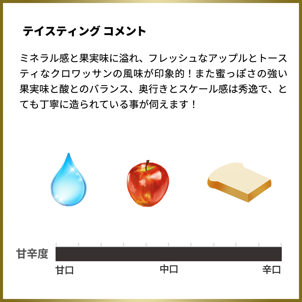 ミネラル感と果実味に溢れ、フレッシュなアップルとトースティなクロワッサンの風味が印象的!また蜜っぽさの強い果実味と酸とのバランス、奥行きとスケール感は秀逸で、とても丁寧に造られている事が伺えます!そこからは当主であり、母でもある彼女の娘 (アンジェリーヌ) への想いが感じられます!優美でクリーミーなキメの細かい泡と繊細で伸びのある酸はポテンシャルの高さを十分に感じることが出来ます!今飲んでも十分に楽しめますが、長期の熟成によってさらに大輪の花を咲かせることが出来る素晴らしいクオリティを備えています!
