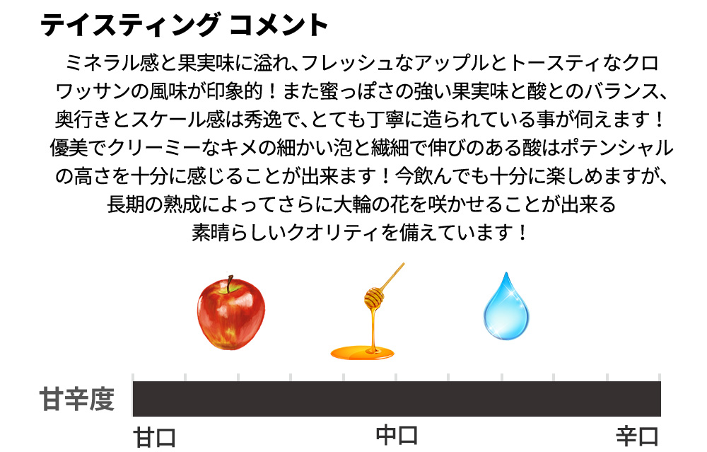 出来のよい年にのみ造られるピノ・ノワール60%とシャルドネ40%が織り成す絶妙なバランスを持った1本!優美でクリーミーなキメの細かい泡と繊細で伸びのある酸はポテンシャルの高さを十分に感じることが出来ます!今飲んでも十分に楽しめますが、長期の熟成によってさらに大輪の花を咲かせることが出来る素晴らしいクオリティを備えています!