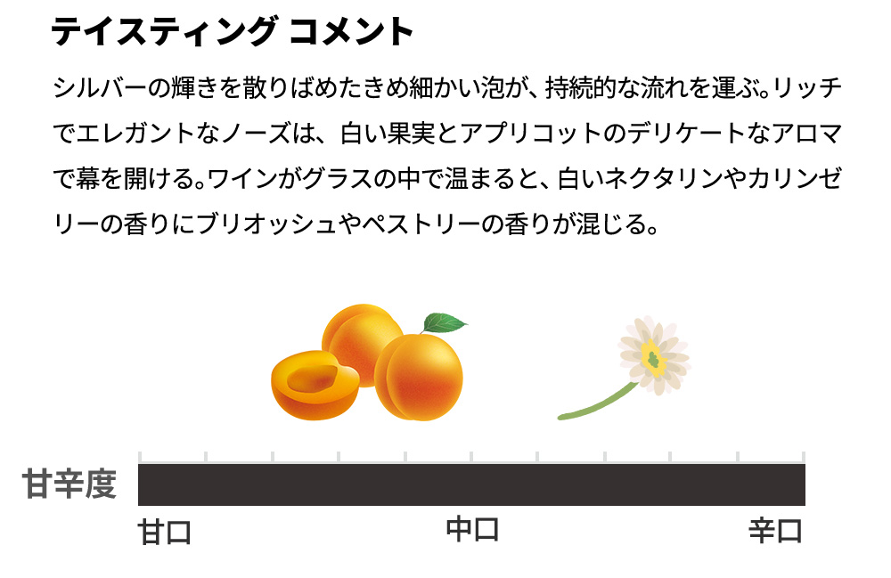 ピノ・ノワールとシャルドネのバランスが良く、熟した果実、チョーク、ブリオッシュ、ナッツやアーモンドのニュアンスを感じられる。フルボディでありながらエレガントでまろやか、チャーミングである一方、しっかりとしたストラクチャーがあり、熟成のポテンシャルも高い。アーモンドクリームやヌガー、グリルしたヘーゼルナッツの香ばしいアロマに、ドライレモンやペストリーの香りが重なり、香ばしく澱の風味が効いたペストリーの風味がなめらかに整っている。フォアグラや鶏肉料理、モリーユ茸を添えた甘鯛料理などリッチな料理との相性も抜群で、温かみのある上質なシャンパーニュを楽しむことができる。