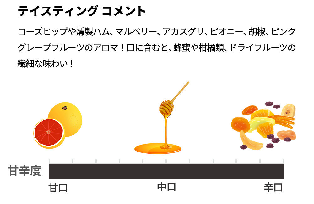 究極の高級ロゼ・シャンパーニュとして、ローズヒップ、燻製ハム、マルベリー、アカスグリ、ピオニー、胡椒、ピンクグレープフルーツのアロマが印象的で、口に含むと蜂蜜や柑橘類、ドライフルーツの繊細な味わいが長い余韻とともに楽しめる。きめ細やかな泡が味わいを一層引き立て、特別な瞬間に相応しい一品となっている。