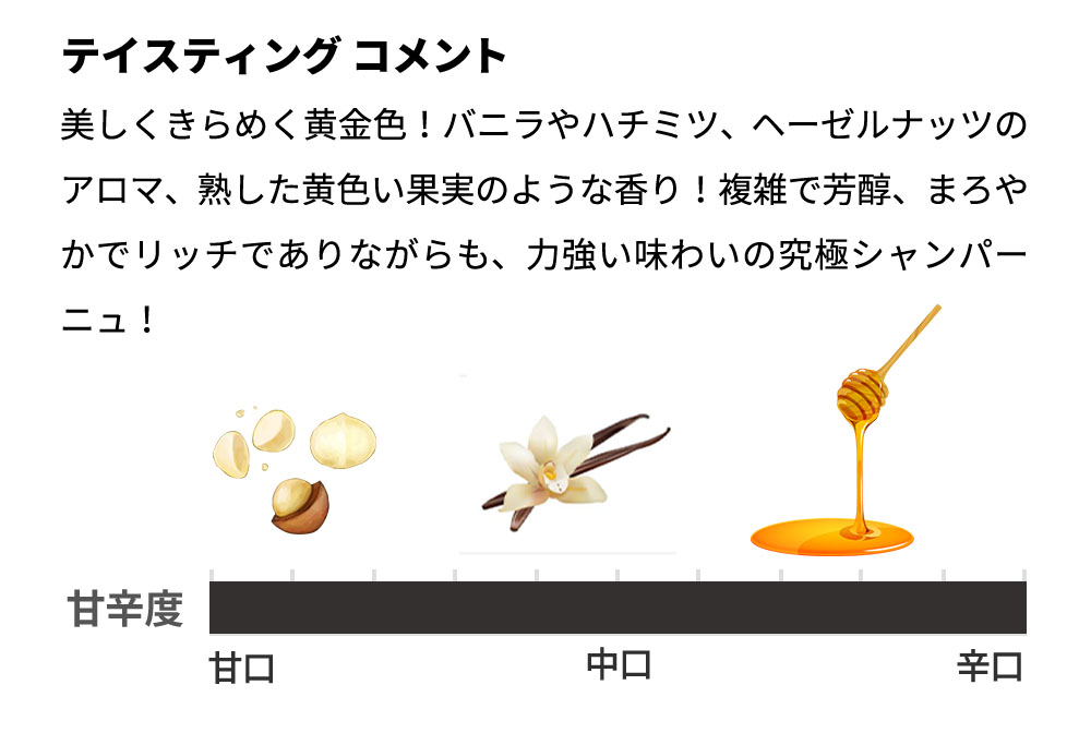 美しく輝く黄金色、バニラやハチミツ、ヘーゼルナッツのアロマ、そして熟した黄色い果実の香りが特徴であり、複雑で芳醇、まろやかでリッチながらも力強い味わいを持つ究極のシャンパーニュです。
