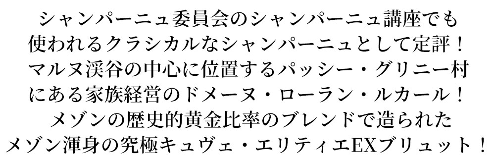 シャンパーニュ辛口愛好家大注目!人気のエクストラ・ブリュット・シャンパーニュ愛好家大注目!ローラン・ルカール・シャンパーニュ・キュヴェ・エリティエ・エクストラ・ブリュットは、ピノ主体の80%のブレンドとシャルドネ20%から造られています。瓶内二次発酵後、瓶熟30ヶ月を経ており、残糖は5g/Lです。