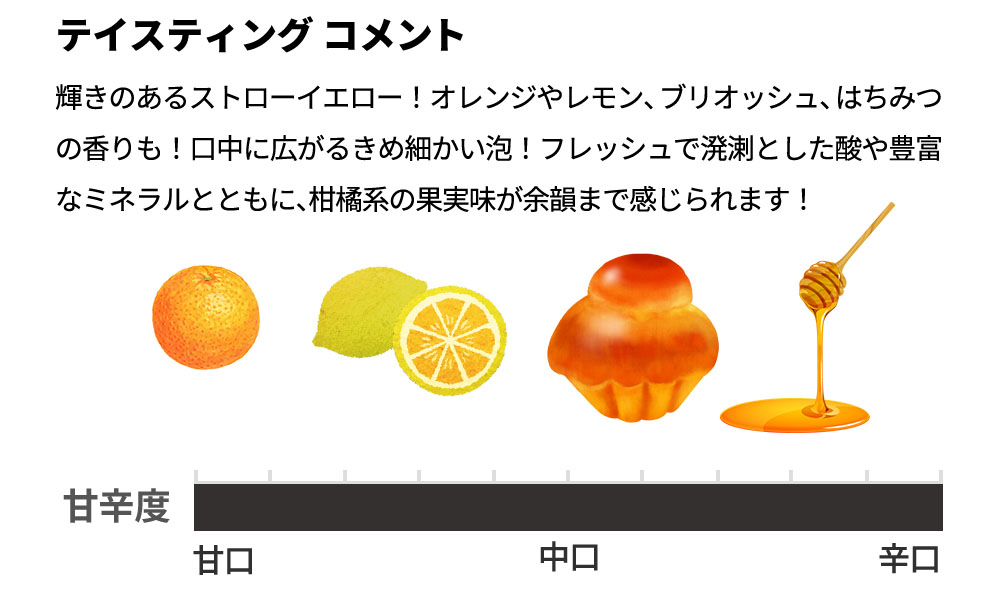 このシャンパーニュは、きめ細かい泡とフレッシュで溌溂とした酸や豊富なミネラルとともに、柑橘系の果実味が余韻まで感じられる美しい味わいを持っています。