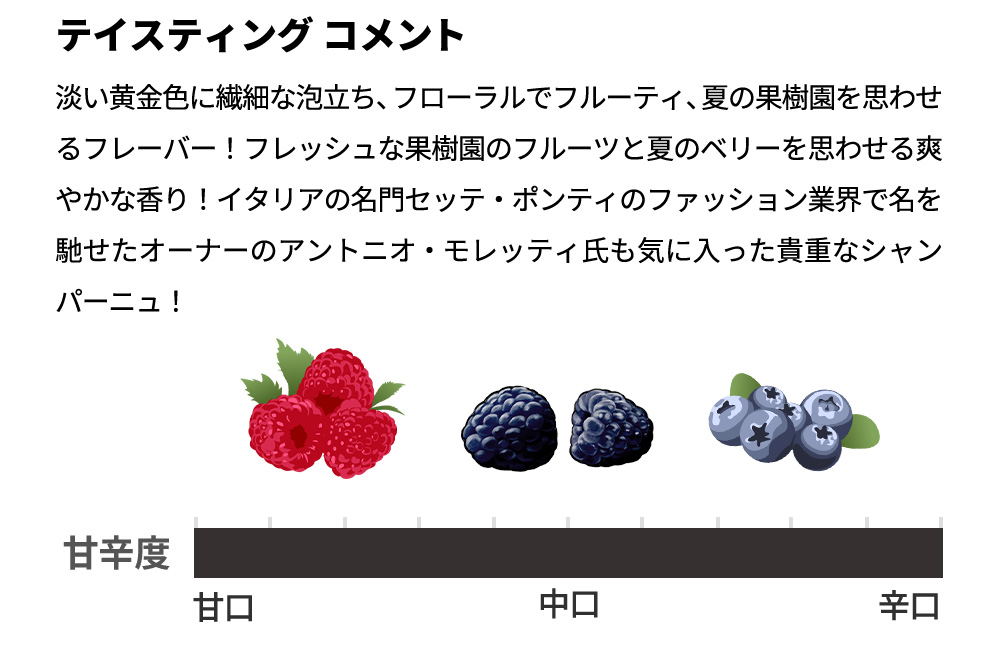 友人たちとの特別なひとときやアペリティフに最適であり、夏の果樹園を思わせる爽やかな香りが楽しめる。限定入荷のこのシャンパーニュは、イタリアの名門生産者も絶賛する価値ある逸品だ。