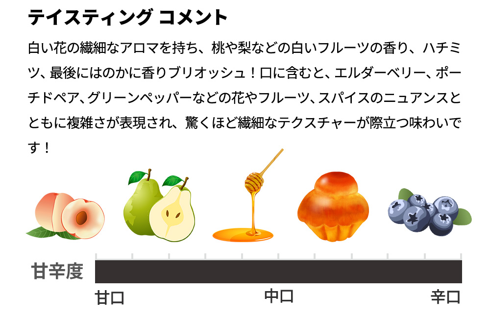 この2016年は、秋の太陽のように輝きのある黄金色と立ち上る繊細な泡立ちが美しい!卓越した豊かなアロマが特徴!白い花の繊細なアロマを持ち、桃や梨などの白いフルーツの香り、ハチミツ、最後にはのかに香りブリオッシュ!口に含むと、エルダーベリー、ポーチドペア、グリーンペッパーなどの花やフルーツ、スパイスのニュアンスとともに複雑さが表現され、驚くほど繊細なテクスチャーが際立つ味わいです!