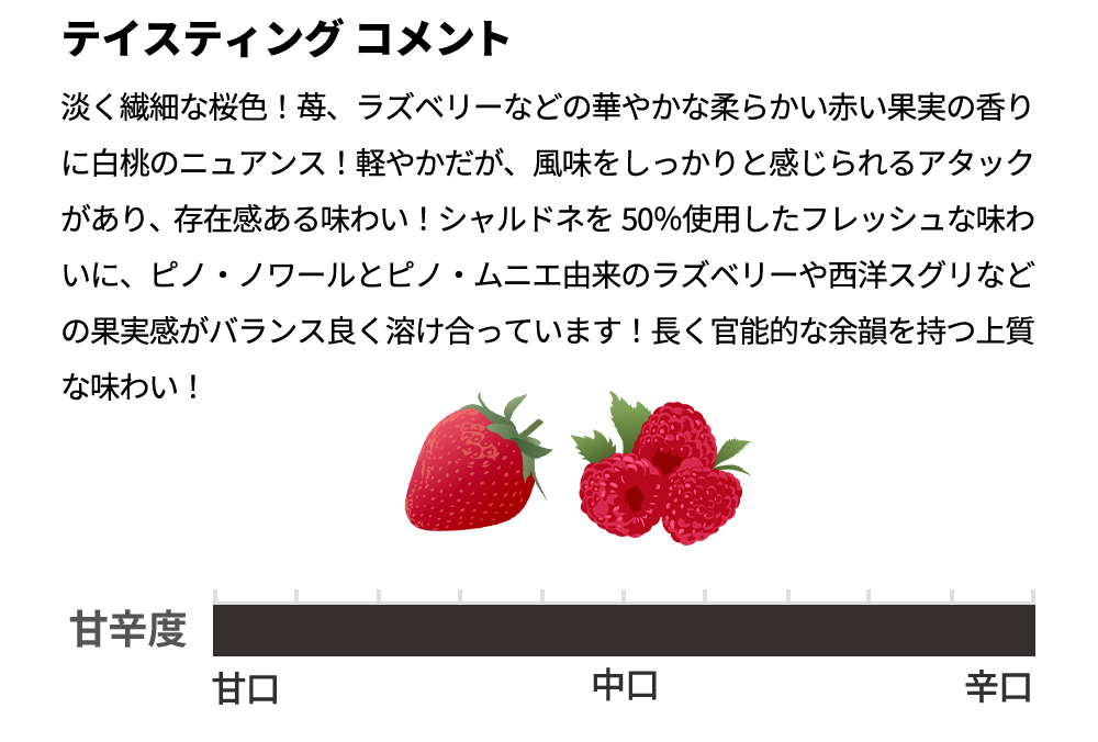 シャルドネを50%使用したフレッシュな味わいに、ピノ・ノワールとピノ・ムニエ由来のラズベリーや西洋スグリなどの果実感がバランス良く溶け合っています!