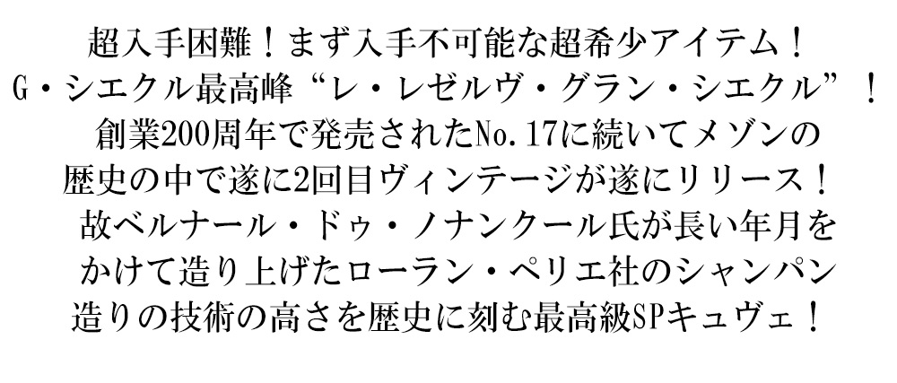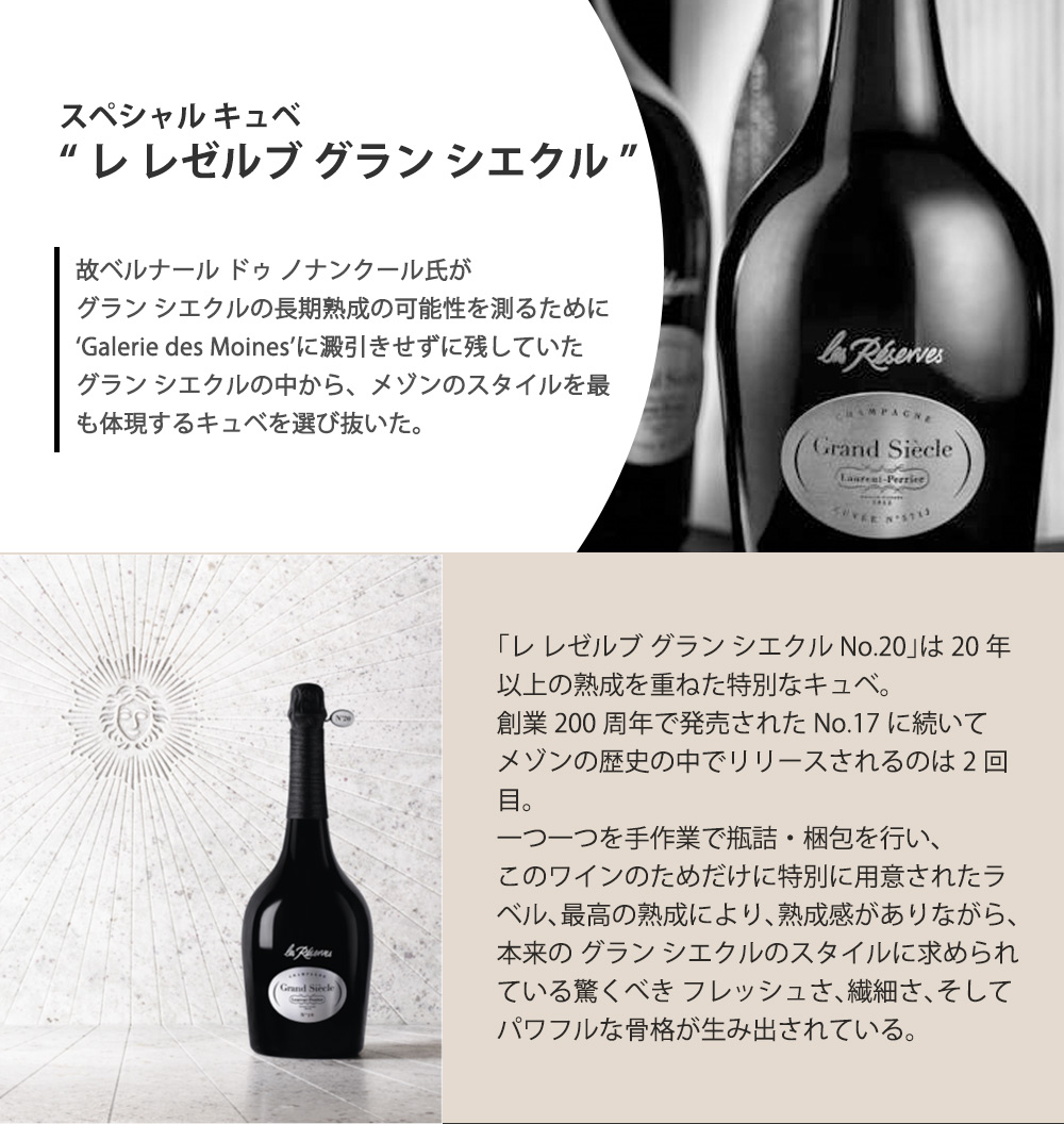 ロバート・パーカー「ワインバイヤーズガイド」で最高満点5つ星獲得し、贅沢なキュヴェの優れた生産者にもローラン・ペリエ社が、創業200周年を記念して、同社を代表するシャンパーニュである“グラン・シエクル”の最高峰“レ・レゼルヴ・グラン・シエクル”。