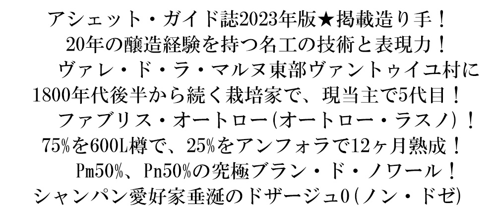 こだわり単一年産100%のブラン・ド・ノワール・シャンパーニュ愛好家大注目!ヴァレ・ド・ラ・マルヌ東部のヴァントゥイユ村に1800年代後半から続くぶどう栽培家で現当主5代目ファブリス・オートロー家によるこだわりシャンパーニュ!