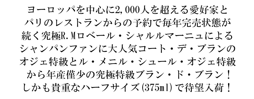 入手困難!グラン・クリュ・特級・R.Mシャンパーニュ愛好家大注目!シャンパーニュ特級愛好家に大人気コート・デ・ブランのシャルドネ100%特級のブラン・ド・ブラン!しかもシャルドネの聖地コート・デ・ブラン!しかもシャンパーニュ愛好家がシャンパンに求めるミネラル感そのものが存在する、ずばりシャルドネ100%のグラン・クリュであり、その中でも酸とミネラルで他のグラン・クリュを圧倒させるグラン・クリュ・オジェのシャルドネで造られるのコート・デ・ブランのル・メニル・シュール・オジェ・グラン・クリュから年産僅少!の究極ブラン・ド・ブラン(シャルドネ100%)辛口シャンパーニュ!しかもハーフサイズ!Dussert-Gerber Guide des Vinsでもなんと2es Grands vin Classessに選出!ヨーロッパを中心に2,000人を超える愛好家とパリのレストランからの予約で毎年完売状態が続く人気R.Mシャンパーニュ!オーナーで醸造家のディディエ・ドラヴィエ氏いわく「僕の畑はメニルとオジェが半分づつ。すべてのキュヴェはこの比率どおりに50/50のブレンド。これが僕のシャンパーニュの個性となっています。ル・メニル・シュル・オジェ産のシャンパンは、はっきりとしたグレープフルーツの風味が特徴で、また瓶熟成によってブリオッシュのような香味が顕著に出てきます。オジェ産はコート・デ・ブランで、最も繊細でスワロフスキーのように美しく、瑞々しい口当たりが特徴です。この2つは隣村同士ですので、ブレンドの相性がよいのかもしれません。」現在販売中のものは、平均樹齢30年、グラン・クリュ・メニル・シュール・オジェ50%、グラン・クリュ・オジェ50%のシャルドネ100%を驚異の48~60ヶ月の瓶熟成!ヴァン・ド・レゼルヴ(全体の約20%)は3~5本分、ドサージュは5~6g/Lの本格派辛口グラン・クリュ・ブラン・ド・ブラン・シャンパーニュの貴重なハーフサイズが限定で、しかも現地のセラー数か月前の蔵出し作品で極少量入荷!