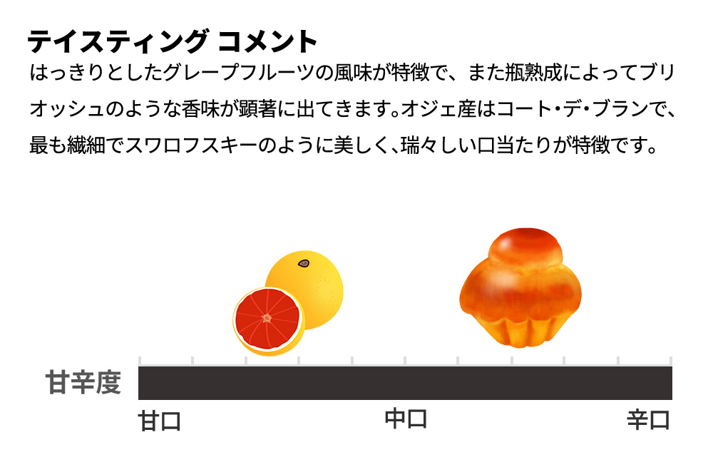 「はっきりとしたグレープフルーツの風味が特徴で、また瓶熟成によってブリオッシュのような香味が顕著に出てきます。オジェ産はコート・デ・ブランで、最も繊細でスワロフスキーのように美しく、瑞々しい口当たりが特徴です。この2つは隣村同士ですので、ブレンドの相性がよいのかもしれません。」