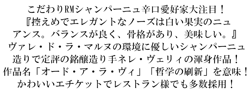 MCRによるドザージュは7g/L!シャンパーニュのタイプは控えめでエレガントなノーズは白い果実のニュアンス!バランスが良く、骨格があり、美味しい!作品名の「オード・ア・ラ・ヴィ」はここでは「哲学の刷新」という意味で、数百年かけて培われてきたシャンパーニュ造りの伝統と、(環境に優しいシャンパン造りといった)新しい考え方を融合させ、新時代のシャンパン造りを目指したいという彼らの哲学を表したものです!
