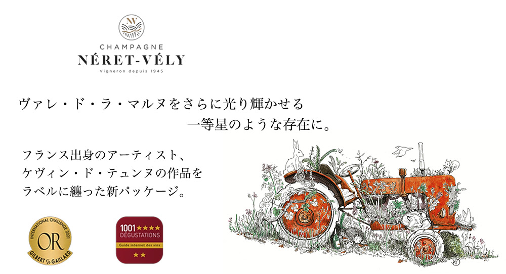 こだわりRMシャンパーニュ辛口愛好家大注目!ヴァレ・ド・ラ・マルヌの環境に優しいシャンパン造りで定評の造り手!「Guide Hachette」、「Gilbert & Gaillad」、「le Petit Fute」、「Elle a Table」等、ワイン誌でも大注目!控えめでエレガントなノーズ、白い果実のニュアンス。バランスが素晴らしく、骨格があり、エチケットと同じく自然で綺麗で美味しい元詰シャンパーニュが限定で少量入荷!生産者ネレ・ヴェリィ・シャンパーニュ(3代目キャロル・ネレ&マリジー・マティアス家)(ドメーヌ継承年2019年)について『ヴァレ・ド・ラ・マルヌのヴォーシャン村に1945年に設立されたRMです。2019年に3代目キャロル・ネレが継承し、旦那さんのマリジー・マティアスと共にメゾンを運営しています。お父さんのアラン・ネレは、環境に優しいシャンパン造りを早くから実践してきたヴィニュロンの一人として知られ、1999年には化学肥料と農薬の使用を止め、厳格なリュット・レゾネ栽培を開始しています。「私たちの畑では季節に応じて色とりどりの花々が咲き誇り、また、ウサギやリス、ハリネズミ、ニワトリ、小鳥、カタツムリ、ミミズ、蝶、てんとう虫といった小動物や虫たちが仲良く暮らしています。土の中の微生物たちも含めてこの多様な生態系が土壌を活性化させ、ぶどう樹にエネルギーを与え、すばらしいぶどうを実らせてくれます。私たちのシャンパンは、動植物たちと力を合わせてみんなで造っています」。彼らの畑はヴァレ・ド・ラ・マルヌの最南東部に展開しています。ピノ・ムニエが白眉であることに変わりありませんが、基盤土壌に白亜(石灰)質が増え、表土には粘土質が増えてくることから、3品種すべてにとって好適というシャンパーニュでも類まれなテロワール条件を持つエリアです。「ネレ・ヴェリィ」のラインナップは、各品種の美質を精緻に捉え、プリズムのように立体的、魅惑的に再構築した見事な構成になっています。ランス出身のアーティスト、ケヴィン・ド・テュンヌの作品をラベルに纏った新パッケージのリリースは2023年。ヴァレ・ド・ラ・マルヌをさらに光り輝かせる一等星のような存在になってくれると思います。』このネレ・ヴェリィ・シャンパーニュ・“オード・ア・ラ・ヴィ” ブラン・ド・ノワールはピノ・ムニエ92%、ピノ・ノワール8%!フェスティニー村、ネル・ル・ルポン村、シャティヨン・シュル・マルヌ村、コンブリジー村の区画より!合計5.5ha!平均樹齢35年のVV(最古は60年以上)!収量は70hl/ha!ステンレスタンクで醸造!ヴァン・ド・レゼルヴが50%!36ヶ月間以上ビン熟成!MCRによるドザージュは7g/L!シャンパーニュのタイプは控えめでエレガントなノーズは白い果実のニュアンス!バランスが良く、骨格があり、美味しい!作品名の「オード・ア・ラ・ヴィ」はここでは「哲学の刷新」という意味で、数百年かけて培われてきたシャンパーニュ造りの伝統と、(環境に優しいシャンパン造りといった)新しい考え方を融合させ、新時代のシャンパン造りを目指したいという彼らの哲学を表したものです!ラベルの絵は、ランス出身のアーティスト、ケヴィン・ド・テュンヌが彼らのために描いてくれたものです!もちろん現地のセラー数ヶ月前の蔵出し品で限定少量入荷!(自然感あふれる人気の動物達とのかわいいエチケットとともにレストラン様でも人気でオンリスト増えています。)