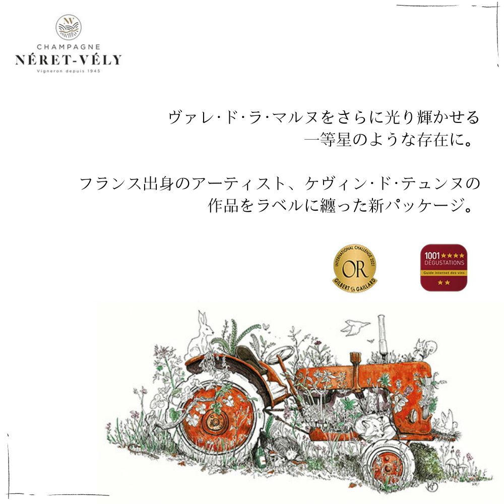生産者ネレ・ヴェリィ・シャンパーニュ(3代目キャロル・ネレ&マリジー・マティアス家)(ドメーヌ継承年2019年)について『ヴァレ・ド・ラ・マルヌのヴォーシャン村に1945年に設立されたRMです。2019年に3代目キャロル・ネレが継承し、旦那さんのマリジー・マティアスと共にメゾンを運営しています。お父さんのアラン・ネレは、環境に優しいシャンパン造りを早くから実践してきたヴィニュロンの一人として知られ、1999年には化学肥料と農薬の使用を止め、厳格なリュット・レゾネ栽培を開始しています。「私たちの畑では季節に応じて色とりどりの花々が咲き誇り、また、ウサギやリス、ハリネズミ、ニワトリ、小鳥、カタツムリ、ミミズ、蝶、てんとう虫といった小動物や虫たちが仲良く暮らしています。土の中の微生物たちも含めてこの多様な生態系が土壌を活性化させ、ぶどう樹にエネルギーを与え、すばらしいぶどうを実らせてくれます。私たちのシャンパンは、動植物たちと力を合わせてみんなで造っています」。彼らの畑はヴァレ・ド・ラ・マルヌの最南東部に展開しています。ピノ・ムニエが白眉であることに変わりありませんが、基盤土壌に白亜(石灰)質が増え、表土には粘土質が増えてくることから、3品種すべてにとって好適というシャンパーニュでも類まれなテロワール条件を持つエリアです。「ネレ・ヴェリィ」のラインナップは、各品種の美質を精緻に捉え、プリズムのように立体的、魅惑的に再構築した見事な構成になっています。ランス出身のアーティスト、ケヴィン・ド・テュンヌの作品をラベルに纏った新パッケージのリリースは2023年。ヴァレ・ド・ラ・マルヌをさらに光り輝かせる一等星のような存在になってくれると思います。』