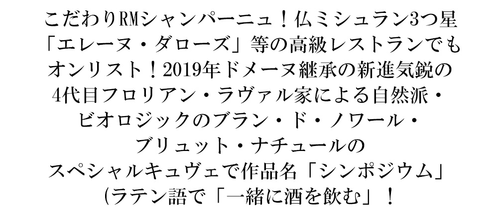 『ラヴァル家は、エペルネ市より西に8km、「ヴァレ・ド・ラ・マルヌ」のブルソー村に1870年より続くぶどう栽培家で、1948年にRMを設立して自社ビン詰めを開始しました。1979年にメゾンを継承した3代目ミッシェルが栽培と醸造の近代化を図り、世界に向けた本格的なブランド展開を開始しました。2019年、「ガストン・シケ」等での修行を終えた4代目フロリアンに世代交代し、2023年に夫妻の名を冠して「オーロール&フロリアン・ラヴァル」と改称しました。代々の長きにわたって厳格なリュット・レゾネ栽培に取り組んできましたが、2021年にフロリアンがビオロジック栽培に進化させました。