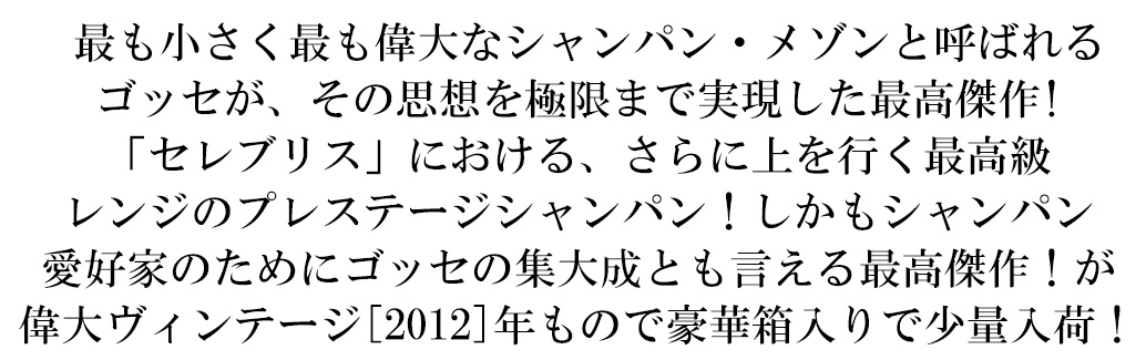 ゴッセ社が誇る最高峰キュヴェで400年の歴史の中でも指折りの年のひとつとなった偉大ヴィンテージ[2012]年ものが正規品で待望入荷!