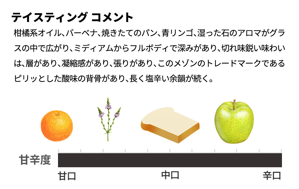 『柑橘系オイル、バーベナ、焼きたてのパン、青リンゴ、湿った石のアロマがグラスの中で広がり、ミディアムからフルボディで深みがあり、切れ味鋭い味わいは、層があり、凝縮感があり、張りがあり、このメゾンのトレードマークであるピリッとした酸味の背骨があり、長く塩辛い余韻が続く。飲み頃、今- 2038年 95点+』