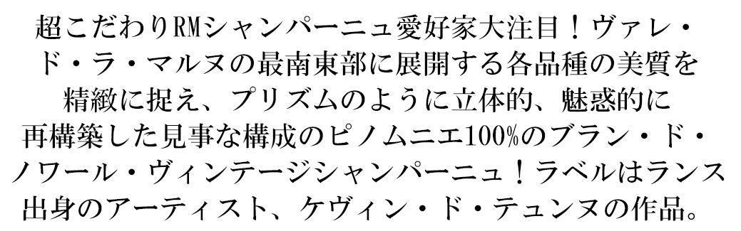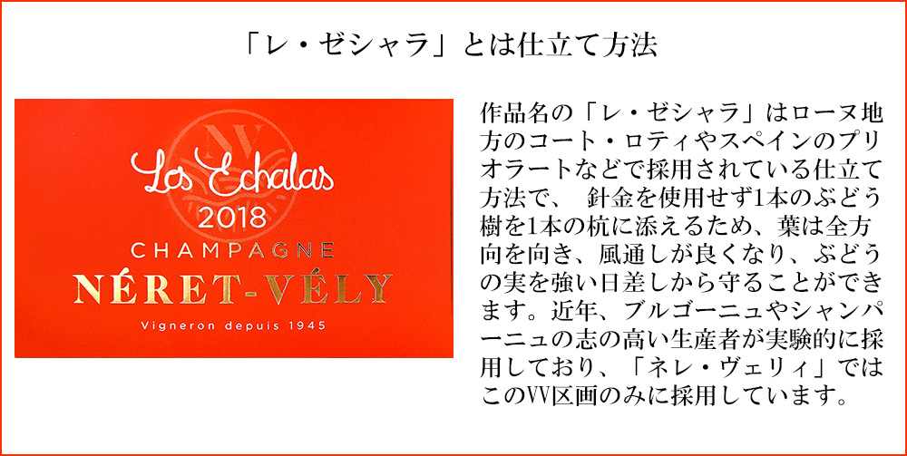 入手困難!入荷即完売!こだわり高級RM(生産者元詰)シャンパーニュ愛好家大注目!「Guide Hachette」、「Gilbert &Gaillad」、「le Petit Fute」、「Elle a Table」等ワインプレスも大注目!ヴァレ・ド・ラ・マルヌのヴォーシャン村に1945年に設立されたRMで、2019年に3代目キャロル・ネレが継承し、旦那さんのマリジー・マティアスと共にドメーヌを運営と同時に人気急上昇中の造り手!作品名の「レ・ゼシャラ」はローヌ地方のコート・ロティやスペインのプリオラートなどで採用されている仕立て方法からきています。生産者についてのコメント!『ヴァレ・ド・ラ・マルヌのヴォーシャン村に1945年に設立されたRMです。2019年に3代目キャロル・ネレが継承し、旦那さんのマリジー・マティアスと共にメゾンを運営しています。お父さんのアラン・ネレは、環境に優しいシャンパン造りを早くから実践してきたヴィニュロンの一人として知られ、1999年には化学肥料と農薬の使用を止め、厳格なリュット・レゾネ栽培を開始しています。「私たちの畑では季節に応じて色とりどりの花々が咲き誇り、また、ウサギやリス、ハリネズミ、ニワトリ、小鳥、カタツムリ、ミミズ、蝶、てんとう虫といった小動物や虫たちが仲良く暮らしています。土の中の微生物たちも含めてこの多様な生態系が土壌を活性化させ、ぶどう樹にエネルギーを与え、すばらしいぶどうを実らせてくれます。私たちのシャンパンは、動植物たちと力を合わせてみんなで造っています」。彼らの畑はヴァレ・ド・ラ・マルヌの最南東部に展開しています。ピノ・ムニエが白眉であることに変わりありませんが、基盤土壌に白亜(石灰)質が増え、表土には粘土質が増えてくることから、3品種すべてにとって好適というシャンパーニュでも類まれなテロワール条件を持つエリアです。「ネレ・ヴェリィ」のラインナップは、各品種の美質を精緻に捉え、プリズムのように立体的、魅惑的に再構築した見事な構成になっています。ランス出身のアーティスト、ケヴィン・ド・テュンヌの作品をラベルに纏った新パッケージのリリースは2023年。ヴァレ・ド・ラ・マルヌをさらに光り輝かせる一等星のような存在になってくれると思います。』このネレ・ヴェリィ・シャンパーニュ・レ・ゼシャラ ・ピュール・ムニエ ・ヴィエイユ・ヴィーニュ・ミレジメ[2018]年・RM(生産者元詰)はピノ・ムニエ種100%のブランドノワールでしかもアシェットガイド誌2025年版でもシャンパーニュに17/20点を付ける(偉大な85,02,12,と同評価)単一年産100%のヴィンテージシャンパーニュ!しかもフェスティニー村の樹齢45年以上のVV区画((1999年より厳格なリュット・レゾネ栽培。2021年にHVE(Haute Valeur Environnementale)の最高段階「レベル3」および「Viticulture Durable en Champagne」の認証を取得。一部馬による耕作を実施))より。わずか0.4haの畑からの希少ブランドノワール・ヴィエイユ・ヴィーニュ・シャンパーニュ!収量は60hl/ha。ステンレスタンクで醸造。MCRによるドザージュは1~2g/L。作品名の「レ・ゼシャラ」はローヌ地方のコート・ロティやスペインのプリオラートなどで採用されている仕立て方法で、 針金を使用せず1本のぶどう樹を1本の杭に添えるため、葉は全方向を向き、風通しが良くなり、ぶどうの実を強い日差しから守ることができます。近年、ブルゴーニュやシャンパーニュの志の高い生産者が実験的に採用しており、「ネレ・ヴェリィ」ではこのVV区画のみに採用しています。「すべての作業が手作業となり大変な手間がかかりますが、収量が低くなり、ぶどうの品質は格段に向上しました」もちろん現地のセラー数ヶ月前の蔵出し作品で極少量入荷!