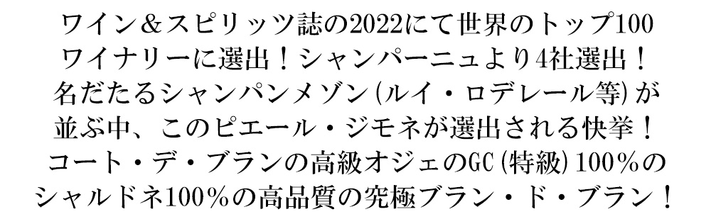 スタンダードの“キュイ”・プルミエ・クリュ・一級で、ワインスペクテーター誌驚異の93点で2024年度年間ランキング第63位(シャンパーニュの選出はこのピエール・ジモネのみという快挙)獲得!ワイン&スピリッツ誌の2022にて世界のトップ100ワイナリーに選出!そのワイン・オブ・ザ・イヤーTOP100にてシャンパーニュより4社選出!名だたるシャンパーニュメゾンが並ぶ中、このピエール・ジモネが選出される快挙!