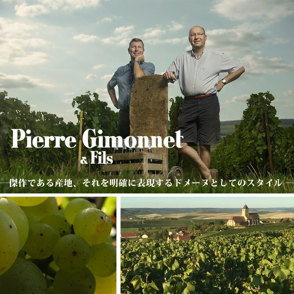 【ピエール・ジモネはシャンパーニュの中心地、ランス近郊で18世紀からぶどうを栽培するメーカーです。1730年からコート・ド・ブラン地区Cuis(キュイ)村で葡萄栽培を開始し、1936年よりぶどう栽培、醸造、瓶詰め、販売まで一貫して行うレコルタン・マニピュランとして、シャンパーニュを生産し始めました。合計26ヘクタールの畑を所有し、14ヘクタールをキュイに、12ヘクタールをクラマンに所有しています。シャルドネ100%で造られるシャンパンは濃密で力強さを持ちながら繊細さもそなえた味わいが特徴です。醗酵から熟成までのあらゆる段階で厳格きわまる基準を貫くことによって、フィネスを閉じ込めた素晴らしいシャンパンが出来上がります。【最高の畑から収穫されたぶどうはピュアな果汁だけを使用し、低温で長時間にわたり1時発酵が行われます。澱からくる独特の香りを最小限に抑え、果実そのものの豊かな香りを出す為に、2次醗酵は瓶の口を下に向けて行われます。徹底した少量生産と発酵、熟成で厳格な基準を貫くことで、ピエール・ジモネのシャンパーニュは6ブランド全てにおいて、ジモネ最大の特徴であるフィネスを感じることが出来ます。フランス・ワイン専門誌La Revue du Vin de Franceでほとんどのキュヴェが5つ星の評価を受けています。もともとはフランス国内で80%以上が消費され、国外では稀少なシャンパンです。【-オリヴィエ&ディディエ・ジモネの言葉- 私達にはコート・デ・ブランは自然の傑作であるという思想が身に付いています。私達が永遠に探求するのは、産地の個性が最上の形でジモネスタイルとして現れる事です。われわれの葡萄は全てコート・デ・ブランのプルミエ・クリュもしくはグランクリュで、これらが他にないアロマパレットを構成しています 。私達は、産地の表現を最大限に尊重するため、自らを「ワインメーカー」ではなく、「産地の代弁者」と名乗ります。ワインは「クリマから生まれた自然な葡萄」から生まれ、それは決して醸造によってもたらされる表現であってはならないと考えます。グラン・シャルドネに特徴的な純粋性、エレガンス、ミネラル感の表れを優先し、ブレンドのたゆみない作業を通じて、素材感、繊細さ、爽やかさの最高のバランスを追求しています。それぞれのキュヴェを的確に結び合わせ、常に最大限に調和を優先します。