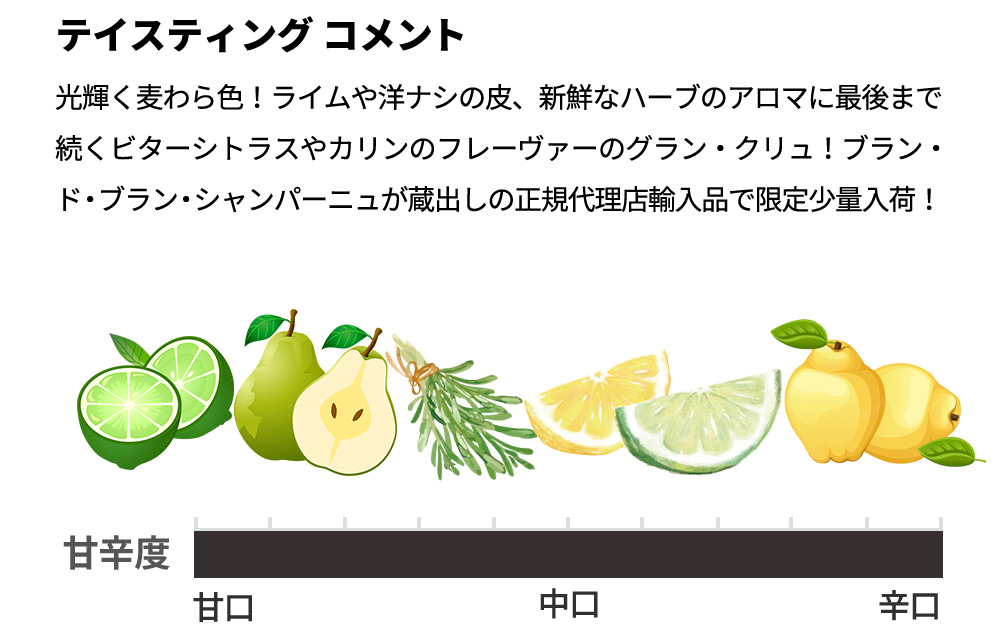光輝く麦わら色!ライムや洋ナシの皮、新鮮なハーブのアロマに最後まで続くビターシトラスやカリンのフレーヴァーのグラン・クリュ!ブラン・ド・ブラン・シャンパーニュが蔵出しの正規代理店輸入品で限定少量入荷!