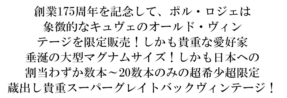 超超入手困難!高級ヴィンテージ・シャンパーニュ辛口愛好家大注目!日本への入荷わずか20数本のみの貴重シャンパーニュ!しかも貴重な大型マグナムサイズ愛好家大注目!しかも単一年産100%高級ミレジメ・シャンパーニュ・辛口フルボディ愛好家大注目!しかも貴重な正規品の22年熟成バックヴィンテージ!しかも大人気スーパーグレイトヴィンテージ2002年もの(ワインアドヴォケイト誌驚異の95点を付ける偉大なヴィンテージ)!しかも豪華木箱入り!しかもこのシャンパーニュは今年、来日したローラン・ダルコート氏(Laurent d’Harcourt(Chairman of the Board))の食事会の席上でお披露目され、その場でテイスティング&予約の2002年ヴィンテージで世界中のシャンパン愛好家の争奪戦シャンパーニュ!しかも日本への入荷わずか数本~20数本のみの超希少超限定蔵出し貴重バックヴィンテージのひとつ!しかも創業175周年を記念して、メゾンは 象徴的なキュヴェのオールド・ヴィンテージを蔵出し限定販売! ローラン・ダルコート氏からのコメントは『これまでは、「pour nous boire 」ということわざがあるように、私たちのポリシーは、これらの古いボトルを 「pour nous boire 」しておくことでした。しかし、アマチュアの方々からも古いヴィンテージに対する需要が高まっていることを認識し、私たちは少し多めの割合でワインを確保しておくことを決意しました。毎年メゾンは今後、4つのヴィンテージ・キュヴェのうち、抜栓後さらに熟成させた1~2ヴィンテージのみを、ごく限られた数量だけリリースする予定にしました。』また、メゾンからのコメントは「数少ない幸福なる人々へ」『現在のラインナップに加え、2024年は4つのヴィンテージ・キュヴェが厳格な割り当てのもと(世界のシャンパン愛好家に)、ヴィノテーク・ワインとして提供されることになりました。これは新商品ではなく、私たちのワインが時の試練にどれだけ耐えられるかを示す機会です。私たちのアイデアは、最初の出荷以来、ポル・ロジェのセラーに保管され、コルクで熟成を続けてきた古いワインを、可能な限り最高の状態を見せることです。 シャンパーニュ地方で最も深い、地下33メートルのセラーで。ヴィノテーク・プロジェクトを一言で言うと非常に少ない数の幸せを非常に少ない数の方のために=「数少ない幸福なる人々へ」』と言うことです。1849年から家族経営を貫く“格調高いシャンパーニュ造り”で有名な大人気メゾン!元イギリス首相チャーチル氏を虜にし、「チャーチル首相」の名を冠した最高級品「キュヴェ・ウィンストン・チャーチル」で有名であり、2004年には英国王室御用達に任命された究極メゾン!ロイヤルウェディングにも使用されたポル・ロジェによる、高級シャンパーニュ!数少ない家族経営のシャンパンハウスの1つであるポル・ロジェは1849年に設立されました。現在は5代目と6代目のファミリーメンバーが運営し、最高の畑から気品溢れるエレガントなシャンパーニュを生産しています。(1849年に設立したポル・ロジェは『気品と優美』を哲学とし、格調高いシャンパーニュを生み出す家族経営ワイナリーです。ブドウ本来の繊細な味わいを引き出すため、木樽を一切使用せずステンレスタンクで醸造し、今でも職人の手作業によるルミュアージュを守り続けています。エペルネで最も深い地下セラーで長期熟成させる事で極上の泡を伴うシャンパーニュが生まれます。その品質は元イギリス首相チャーチルをも虜にし、2004年に英国王室御用達に任命されました。また、2011年・2018年のロイヤル・ウエディングでも提供され、国際的に高い評価を得ています。)(また世界中のプロフェッショナル達からも信頼の厚いフランスの権威あるガイド誌「メイユール・ヴァン・ド・フランス」において最高評価の★★★に昇格を果たしました。 同じ評価を受けるシャンパン生産者はボランジェ、クリュッグ、サロン、ジャクソン、ジャック・セロス、エグリ・ウーリエなど正に当代を代表する偉大なる生産者ばかり。 )エペルネのシャンパーニュ通りに面したワイナリーの地下深くにある広大なカーヴでゆっくりと熟成させる事で複雑なアロマと繊細な泡が生まれ、素晴らしいシャンパーニュに仕上がります。繊細で優美なスタイルは料理との相性も良く、多くのソムリエに支持されています。ポル・ロジェ家は世界で最も名高い家族経営ワイナリー12社からなる団体、プリムム・ファミリエ・ヴィニの誇り高いメンバーであり、家族経営によるワイン造りの価値を啓蒙しています。通常のボトルと異なり、メゾンのカーヴで長期間熟成された特別なコレクション「ヴィノテーク」(魔法)。リリースされる数量は極端に少ない貴重なワインです。ポル・ロジェ社の伝統的なブレンドによるもので、モンターニュ・ド・ランス、グラン・ヴァレ・ド・ラ・マルヌ、コート・デ・ブランにある20のグラン・クリュとプルミエ・クリュのブドウを使用しています。基本的に