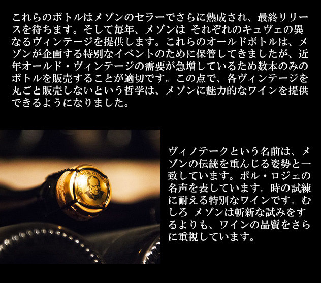 通常のボトルと異なり、メゾンのカーヴで長期間熟成された特別なコレクション「ヴィノテーク」(魔法)。リリースされる数量は極端に少ない貴重なワインです。