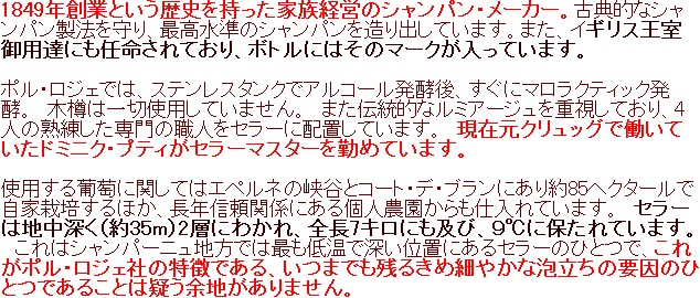 ポル・ロジェ社の伝統的なブレンドによるもので、モンターニュ・ド・ランス、グラン・ヴァレ・ド・ラ・マルヌ、コート・デ・ブランにある20のグラン・クリュとプルミエ・クリュのブドウを使用しています。