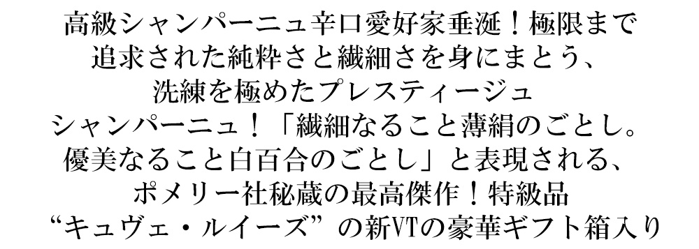 極限まで追求された純粋さと繊細さを身にまとう、洗練を極めたプレスティージュ シャンパーニュ!「繊細なること薄絹のごとし。優美なること白百合のごとし」と表現される、ポメリー社秘蔵の最高傑作!