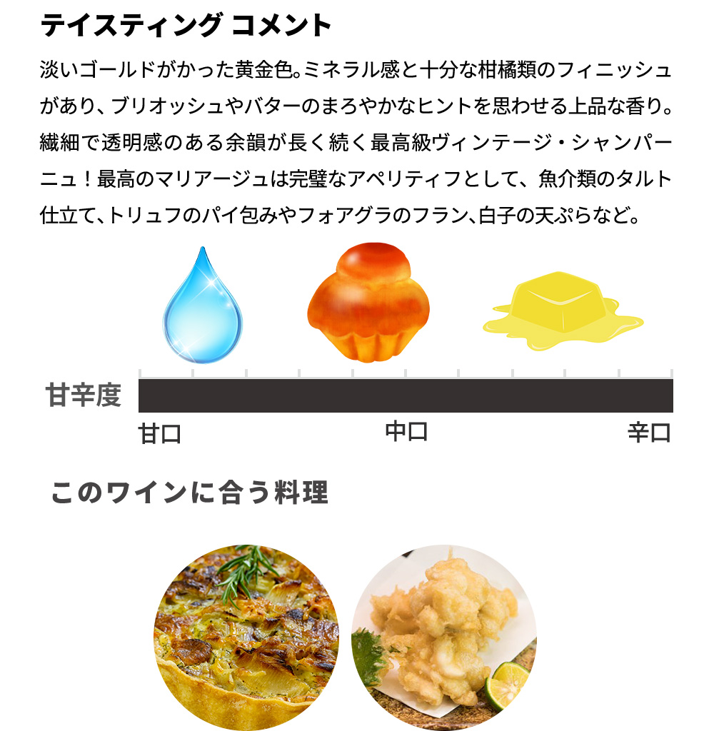 最高のマリアージュは完璧なアペリティフとして、魚介類のタルト仕立て、トリュフのパイ包みやフォアグラのフラン、白子の天ぷらなど和洋問わず最初から最後まで楽しめます、まさにプレステージシャンパーニュを代表する1本です。淡いゴールドがかった黄金色。ミネラル感と十分な柑橘類のフィニッシュがあり、ブリオッシュやバターのまろやかなヒントを思わせる上品な香り。繊細で透明感のある余韻が長く続く最高級ヴィンテージ・シャンパーニュが人気の2006年V.Tで豪華ギフト箱入で正規代理店輸入品で限定少量入荷!