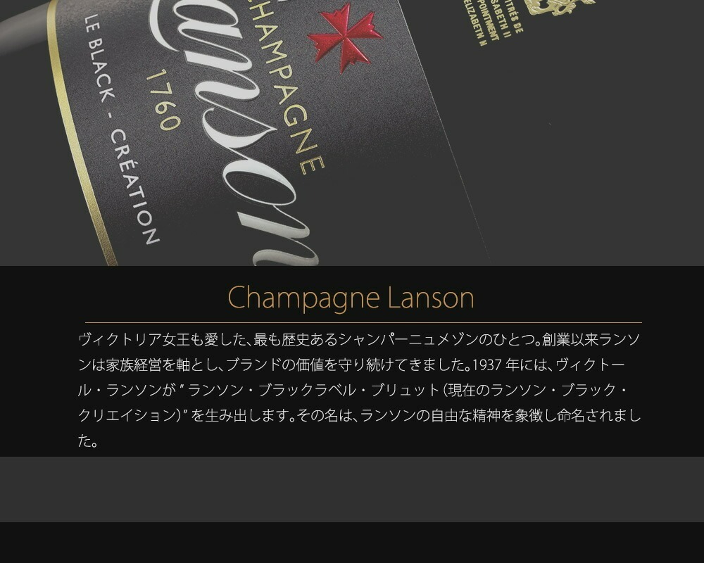 大人気シャンパーニュ愛好家大注目!大型ジェロボアムファン大注目!あの大人気シャンパーニュのジェロボアム(3000ml)超大型サイズが待望入荷!名門中の名門!英国王室御用達!の名門ランソン社の逸品!あまりに有名!キリッと引き締まったエレガントな辛口!大人気ブラック・ラベルが「ランソン・ブラック・クリエイション・ブリュット」に名称変更され遂に正規品で登場!一世紀以上もの間、英国王室御用達のシャンパーニュとして王室に愛され続け、また、ウィンブルドン・テニストーナメントの公式シャンパーニュとしても長年にわたり選ばれ続けています!「1760年に創業された最も歴史のあるシャンパーニュ・メゾンの一つ。伝統と独自の専門知識、そしてシャンパーニュ造りへの深い愛情を持ち、最高品質のシャンパーニュの製造に情熱を注いできました。その卓越した品質は世界中のワイン愛好家や専門家から高く評価されています。英国王室御用達のシャンパーニュとして一世紀以上も愛され続けており、ボトルにはその証である英国王室の紋章が刻まれています。王室公式シャンパーニュの栄誉を授与して以来、その称号を一度も失っていない唯一のメゾン。ランソンでは、ノン・マロラクティック醗酵を採用することで、爽やかな酸味とフレッシュでクリーンな口当たりを実現。この製法がランソンのシャンパーニュを特徴づけています。シャンパーニュ・ランソンのテーマは「A FRESH TOUCH OF LOVE」。ランソンでは、テロワールや人に対する「愛」を持ち続けることを大切にしています。愛は当たり前のものではない、というのがランソンの考えです。愛を持ち続けるためには、常に新鮮(FRESH)な気持ちで愛を更新することが必要だとの思いでワイン造りを行っています。ランソンの特徴であるノン・マロラクティック製法によるフレッシュな味わいは、ランソンの考える「A FRESH TOUCH OF LOVE」そのものです。最高醸造責任者のエルヴェ・ダンタン氏は、シャンパーニュ地方マルヌ村にワイン生産者の息子として生まれました。ボルドー、アルザス、ブルゴーニュやアメリカで経験を重ねた後、わずか25歳でシャンパーニュのワインメーカーに抜擢。シャンパーニュ・メゾンで22年間にわたってワイン造りの経験を積み、2013年にランソンに最高醸造責任者として加入しました。55ものクリュ別タンクの導入やスタンダード・キュヴェの一新など、ダンタン氏はその情熱と創造性をもって、ランソンに数々の革新をもたらしています。」ランソンはシャンパーニュにおける情報の透明性のパイオニアです!2009年には他メゾンに先駆けてデゴルジュマン日を裏ラベルに記載!2023年には情報の透明性を体現する取り組みの一つとして“クリエイション・シリーズ” を開始!スタンダードキュヴェにもQRコードを通じて収穫年の情報や産地情報など非常に細かい情報を提供しています!この「ランソン・ブラック・クリエイション・ブリュット」は、白亜質土壌からのピノ・ノワール50%、シャルドネ35%、ピノ・ムニエ15%(特級&1級畑比率50%以上)を最低でも驚異の4年以上の熟成!しかも創業の1760年から数えて、「258回目の収穫年(=2018年)をベースワインとして使用!しかもパーペチュアル・リザーヴを全体の32%使用の贅沢仕様!デゴルジュ後さらに6ヶ月間セラーで熟成でリリース!(クリエイションは、通常隠れてしまうベースワインの収穫年の特徴を引き出し、その年の個性やブレンドの詳細など、すべての情報を公開しています。収穫年の違いは、ラベルの横に表示される数字で示され、ファーストリリースからのブレンド回数を表しています。クリエイションに関する詳細情報は、ラベルのQRコードを読み取ることで、誰でも簡単にアクセスできます。)しかも新鮮さを残すためあえてマロラクティック醗酵を行わないことで有名!しかもドサージュ9g/Lの本格派!生き生きとした春に咲く花やシトラス、マンダリンのアロマにトーストのニュアンス!様々な花の蜜の香りとスパイスの長い余韻!世界のワインライター絶賛の気品あふれるエレガントな味わい!新しく生まれ変わったランソン・ブラック・クリエイション・ブリュット!超極上辛口シャンパーニュがしかも愛好家垂涎の特大ボトル・特級シャンパーニュのジェロボアム(3000ml)超大型サイズで豪華木箱入りで超限定入荷!記念パーティーや叙勲祝賀会、結婚式などのお祝い用として大変人気があります。